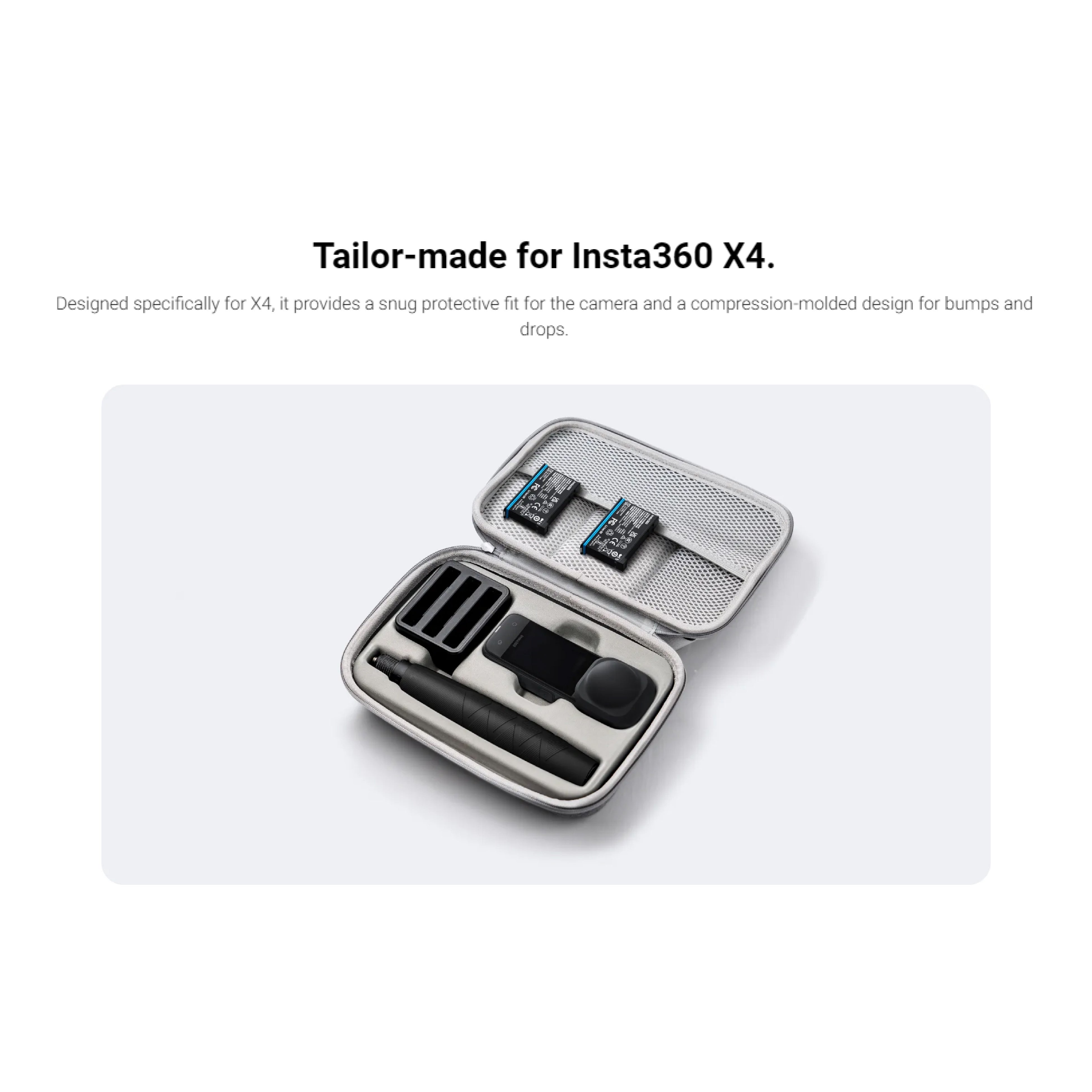 Snug fit for your X4 camera, two batteries, Fast Charge Hub, and 85cm Invisible Selfie Stick. Fits X4 with the Premium/Standard Lens Guards, Lens Cap, and Thermo Grip Cover installed. Fits the 85cm Invisible Selfie Stick with the Selfie Stick Sleeve installed.