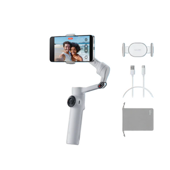 The device features 3-axis stabilization for smooth footage and includes a built-in selfie stick, tripod, and power bank for added convenience. It offers AI-powered Deep Track 4.0, SmartWheel control, and 1-tap pairing with the Insta360 app, which also supports remote control via smartphone or Apple Watch. With effects like Barrel Roll and Dolly Zoom, users can shoot and edit creative videos easily, and the magnetic phone clamp ensures a quick and secure setup.